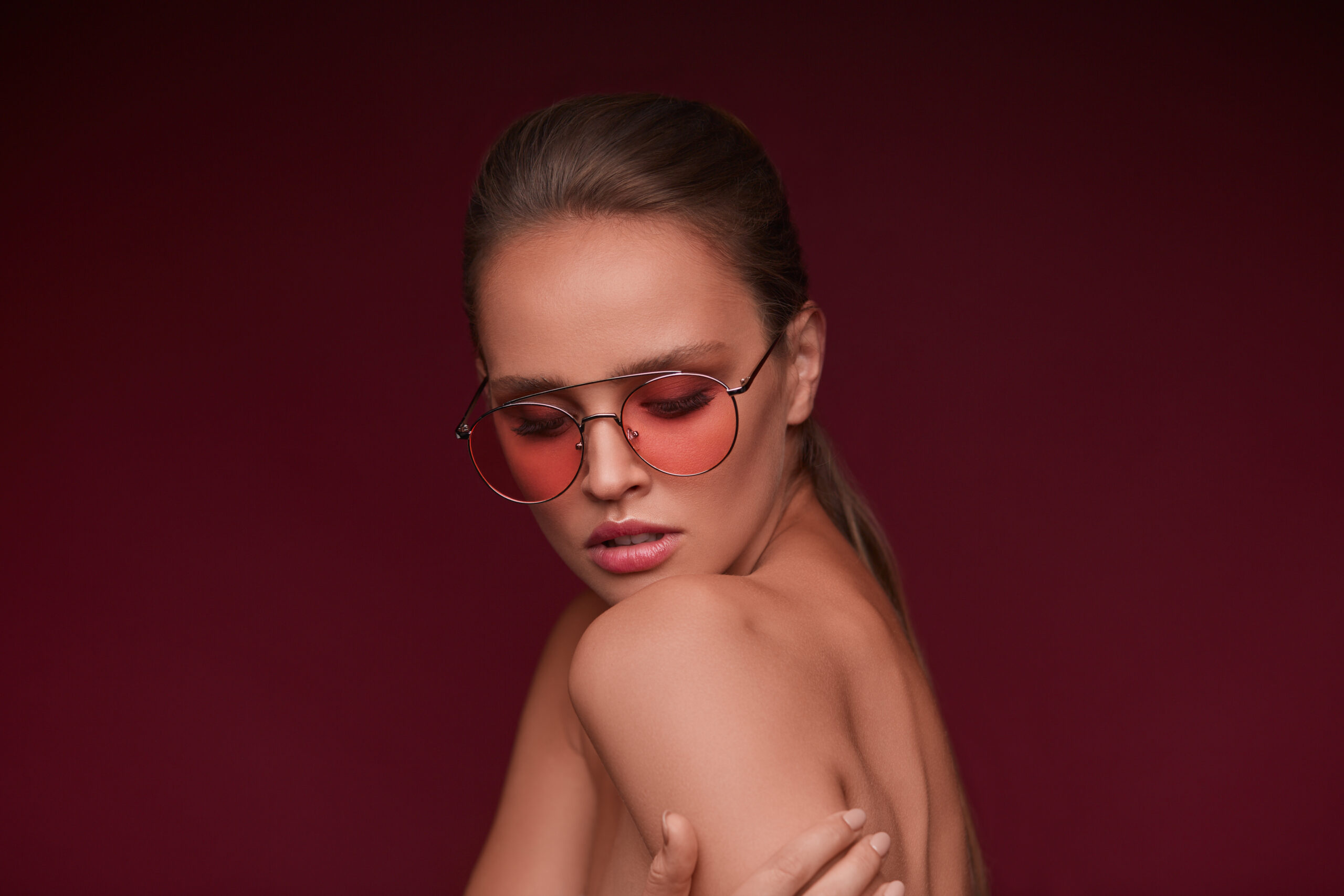 Portrait of beautiful young woman with perfect makeup wearing pink sunglasses. Smiling fashion model in aviator sunglasses posing on burgundy background. Studio shot. Summer vacation.